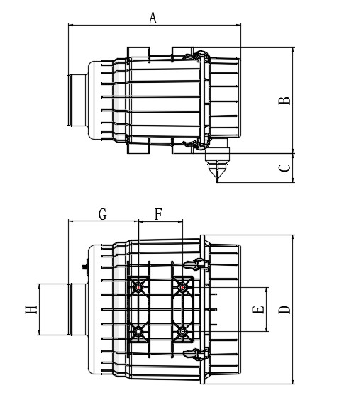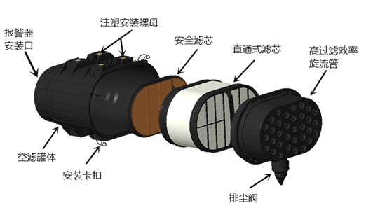 LEF600一體式緊湊型高效進氣系統(tǒng),由前段高過濾效率旋流管(專利產(chǎn)品)、直通式濾芯、安全濾芯和空濾罐體構(gòu)成。